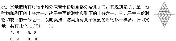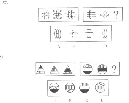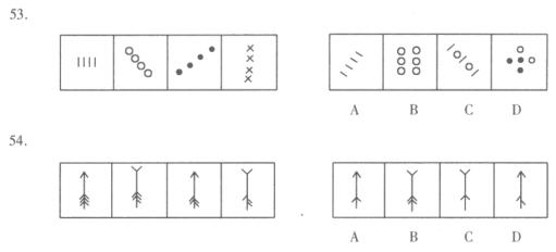 2. 每道题包含两套图形和可供选择的4个图形。这两套图形具有某种相似性,也存在某种差异。要求你从四个选项中选择你认为最适合取代问号的一个。正确的答案应不仅使两套图形表现出最大的相似性,而且使第二套图形也表现出自己的特征。
