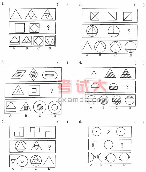 这类题型考查考生对事物的逻辑推理能力,根据两个或两类事物之间某些属性上的相同或相识做出一种推断。通过题中给出的一对相关词,在备选答案中选出一对与之在逻辑关系上最为贴近或相似的词,请将正确答案填写在括号中。