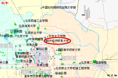 对外经济贸易大学位于北京市朝阳区惠新东街12号,处于三环和四环的中间位置,向西路对面是“中国日报社”,向南是“中日友好医院”,“北京中医学院”,向北是“中国石化”,向东是“芍药居” ……