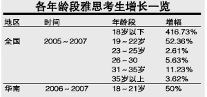 据史哲明介绍,从雅思考试中心2005~2007年提供的数据显示,参加雅思考试群体越来越年轻化,尤其以18~21岁增长明显。据资料显示,华南地区18~21岁阶段报考雅思的人数,由去年近5000人增加到今年1万多人,增幅超过50%。