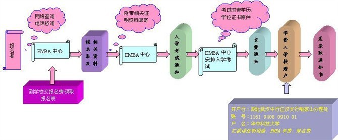 1、申请人向教学点递交《EMBA报名申请表》。 2、华中科技大学EMBA教育中心初审,并向符合招生条件的申请人发放正式报名表格。 3、申请人在规定时间内提交考试费和完整的报名材料,包括: ①报名表及入学资格审查表各一份; ②身份证复印件两份;本科学历、学位证书原件(验证后退回)及复印件各一份 ③加密的专家及单位主管的推荐信各一份; ④6张一寸登记照片(请在背后署名),电子照片一张(邮件或磁盘提交); ⑤成就与奖励有关证书的复印件; ⑥结合本企业情况和自身管理经验,探讨企业管理问题的自命题作文一篇; ⑦报名人所在企业的组织结构图并标注申请者所在的位置。 4、华中科技大学EMBA教育中心对报名材料进行审核,向合格者发出入学考试通知书。 5、申请人在规定时间参加入学考试并进行资格审查。考试时需要带学历、学位证书原件。 6、确定录取名单,并上报华中科技大学研究生院审核批准。 7、由华中科技大学研究生院发放录取通知书。 |