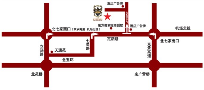 *机场北线→北七家出口直行1000米→大东流方向右转沿标识到达酒店。