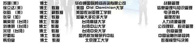 宋铠 博导,资管学会大陆学术委员会主任委员,台湾中山大学信息管理系主任、台湾中央大学信息管理系主任、台湾中央大学管理学院院长、台湾中央大学管理学术研究中心主任。华中科技大学EMBA客座教授、北京大学顾问教授、北京航空航天大学顾问教授、上海复旦大学顾问教授、同济大学顾问教授。曾任美国罗彻斯特工艺大学荣誉教授兼系统工程研究所所长、美国施乐(Xerox)总公司高级工程师。