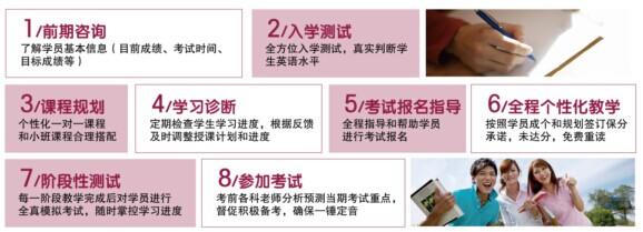 精英保分计划是VIP学习中心挑选顶级名师,精心设计的课程,专门为有目标分数和特定需求的学员准备,通过8个教学和服务流程,帮助学员达到目标分数。