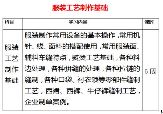 服装制作常用设备的基本操作,常用机针、线、面料的搭配使用,常用服装面、辅料车缝特点,熨烫工艺基础,各种料边处理,各种拼缝的处理,各种拉链的缝制,各种口袋、衬衣领等零部件缝制工艺,西裙、西裤、牛仔裤缝制工艺,企业制单案例。