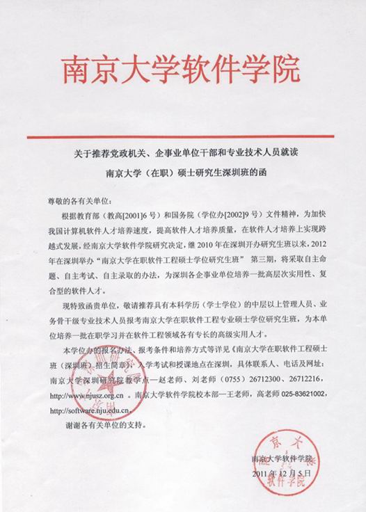 南京大学是教育部直属的全国重点综合性大学,是首批列入国家“211工程”和“985工程”重点建设的大学之一,是国家“111计划”和“珠峰计划”重点建设的名牌大学。南京大学软件学院是教育部和国家计委批准设立的国家级示范性软件学院。根据国家教育部和国务院学位委员会相关文件的规定,经南京大学软件学院批准,南京大学软件学院与南京大学深圳研究院在深圳联合招收培养在职软件工程硕士专业学位研究生。