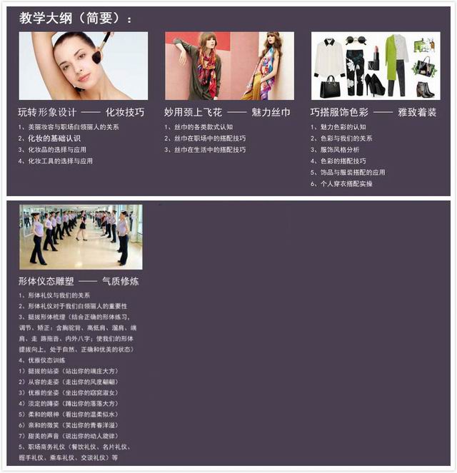 课程从人性和需求出发,分别从化妆,服饰和气质等礼仪培训,通过现场演练、点评和典型案例分析,让学员换发热情与自信,找出属于自己的个人形象气质。