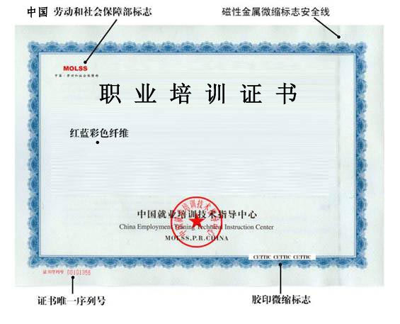 主色调为蓝色,证书规格长29.7cm,宽为21cm,正面为蓝色花边和底纹,左侧上角为劳动和社会保障部标志。正下面为“中国就业培训技术指导中心”和“China Employment Training Technical Instruction Center MOLSS,P.R.CHINA ”及“中国就业技术指导中心”的公章。左下角印有证书序列号。背面为蓝色花边和底纹,左边印有证书中文说明,右边印有英文对照。