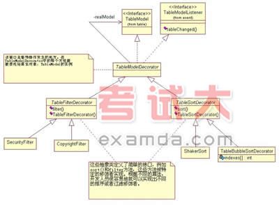 上面的排序修饰者可以给任何的表模型增加排序功能。但是TableSortDecorator类的代码重用性能并不是很好,这是因为它实现了两个不应该由它实现的功能:第一个功能是将方法调用传递给真实对象,这是由于其他的表模型修饰者也会使用完全相同的代码,由于该功能的普适性,它应该被移到类层次中较高的层次上;第二个是排序,在上面的例子中使用的是冒泡排序法,而排序的算法在类层次中是非常特殊的部分,因此需要被移到较低的层次上。图8展示了根据上面两点意见修改后的排序修饰者的类图。