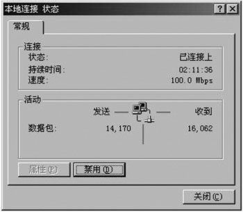 5.验证效果。双击系统托盘上的本地连接图标,属性按钮已经变成灰色(如图4),无法打开网络属性,自然也就不能修改IP地址。需要说明的是,必须事先在本地连接的属性框中选择“连接后在任务栏中显示图标”。(见图5)