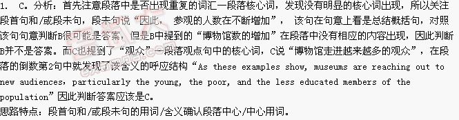 1.E。 分析:首先注意段落中是否出现重复的词汇—段落核心词,发现没有明显的核心词出现,所以关注段首句和/或段未句,发现段首句的结构是“许多博物馆的馆长意识到..”,因此判断该句是观点句—借助权威人士之口阐述观点,但是该句句意与被选项之间似乎并没有关系,段未句说“博物馆应该是喜欢的地方”。注意段落中的特殊句子:举例句:In many science museums,for example, there are no guided tours,Many museums now provide educational services and children’s departments 这些句子在讲述博物馆的变化,但是段落中并没有提到“造成变化的原因”,因此排除A,比较剩下的选项判断E合适:D和F都太具体,而E正是对段首句和段未句的句意的概括。
